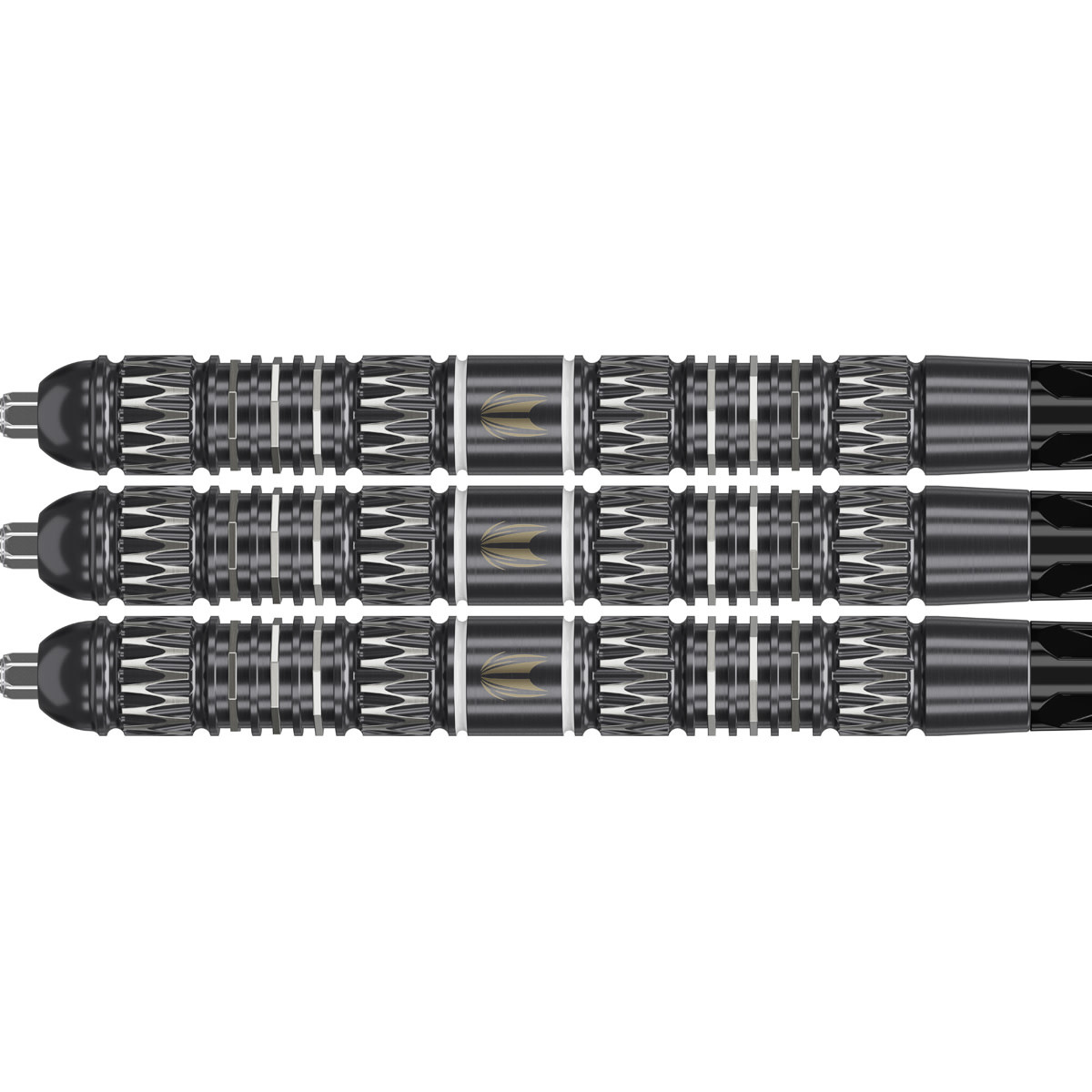 Each barrel is manufactured from 95% tungsten and features a straight-barrel profile, offering a uniform feel along the full length for consistent grip reference and balanced release. Precision CNC milling and advanced re-machining processes create a combination of radial grooves and fine milling patterns, producing a structured yet comfortable grip that supports controlled acceleration and clean separation from the hand. Finished with a black PVD performance coating, the barrel delivers enhanced durability while contrasting sharply with the machined silver detailing for a refined, professional aesthetic.
