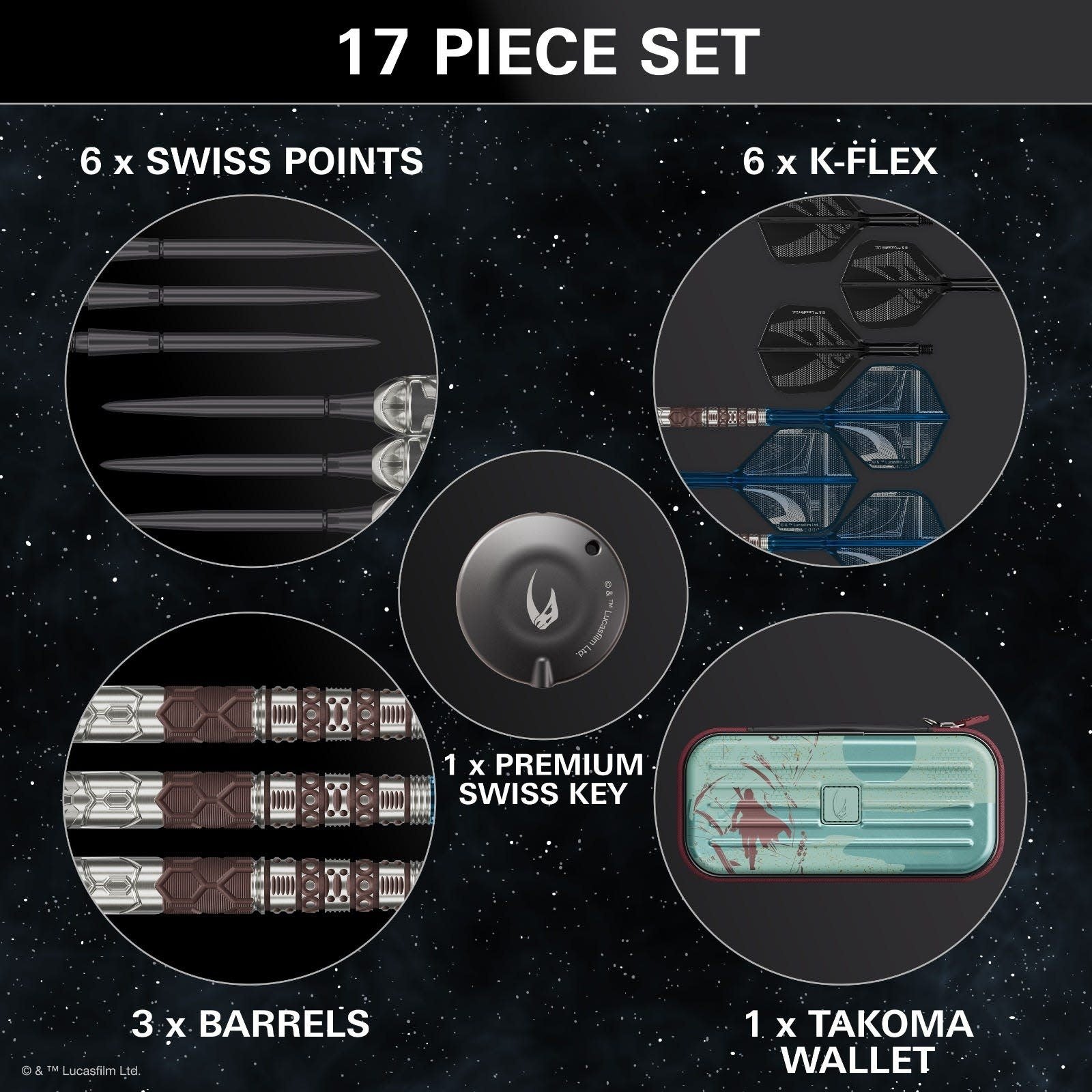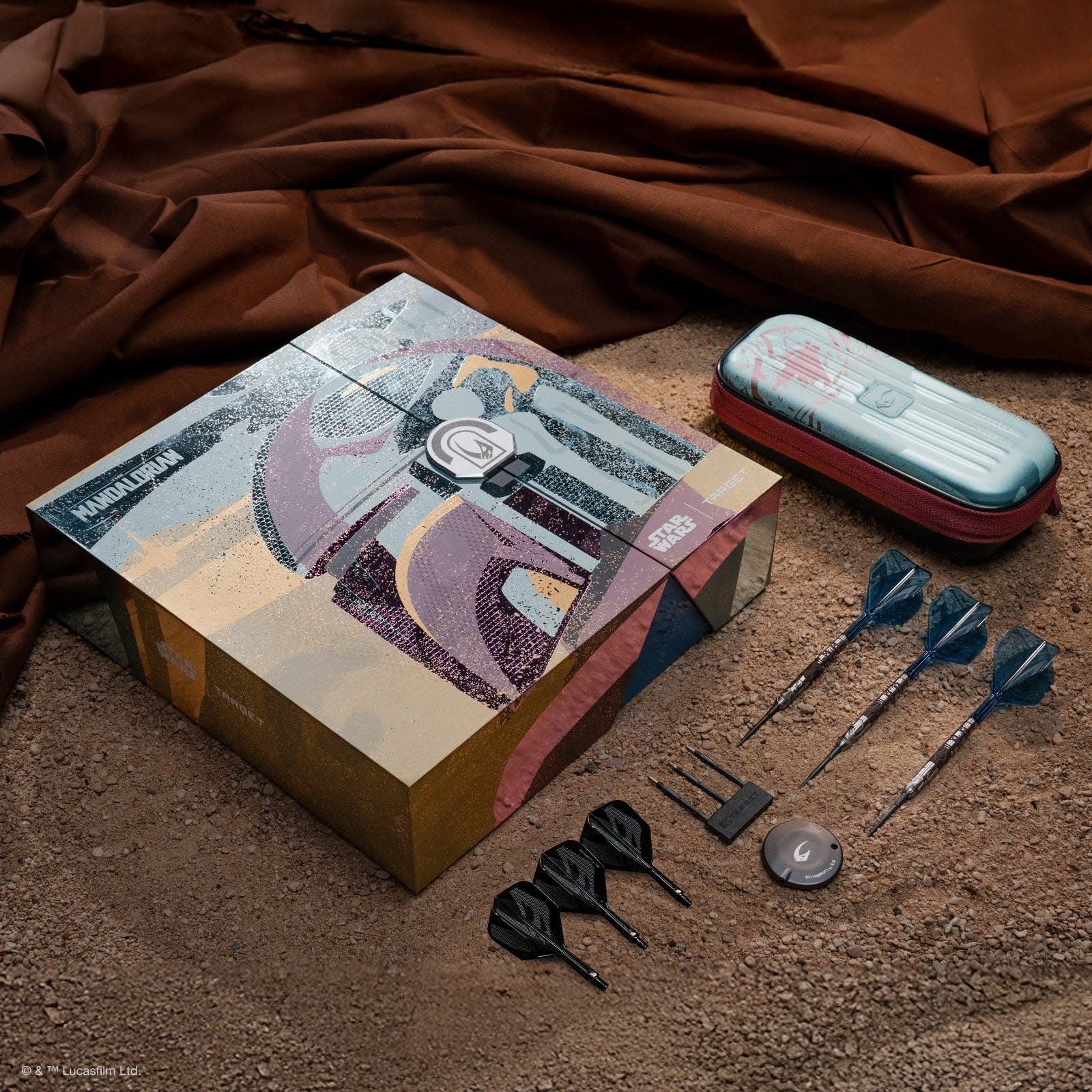 Includes a Mandalorian-inspired Takoma wallet featuring a rigid outer shell and scratch resistant lining, designed to keep your darts protected, secure, and organised wherever you play.